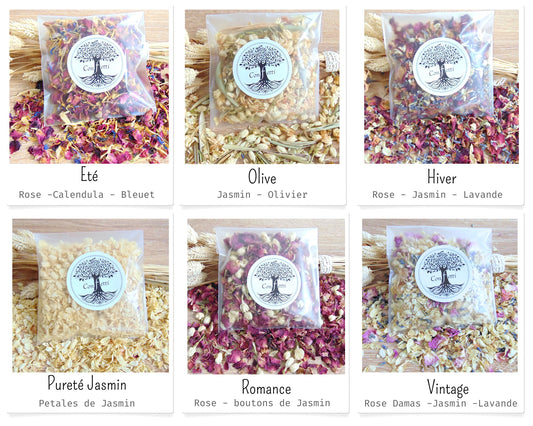 Voir tous nos produitCompositions très riches en fleurs séchées : pétales de Rose, Lavande de Provence, Jasmin, Pivoine, Bleuet, ...