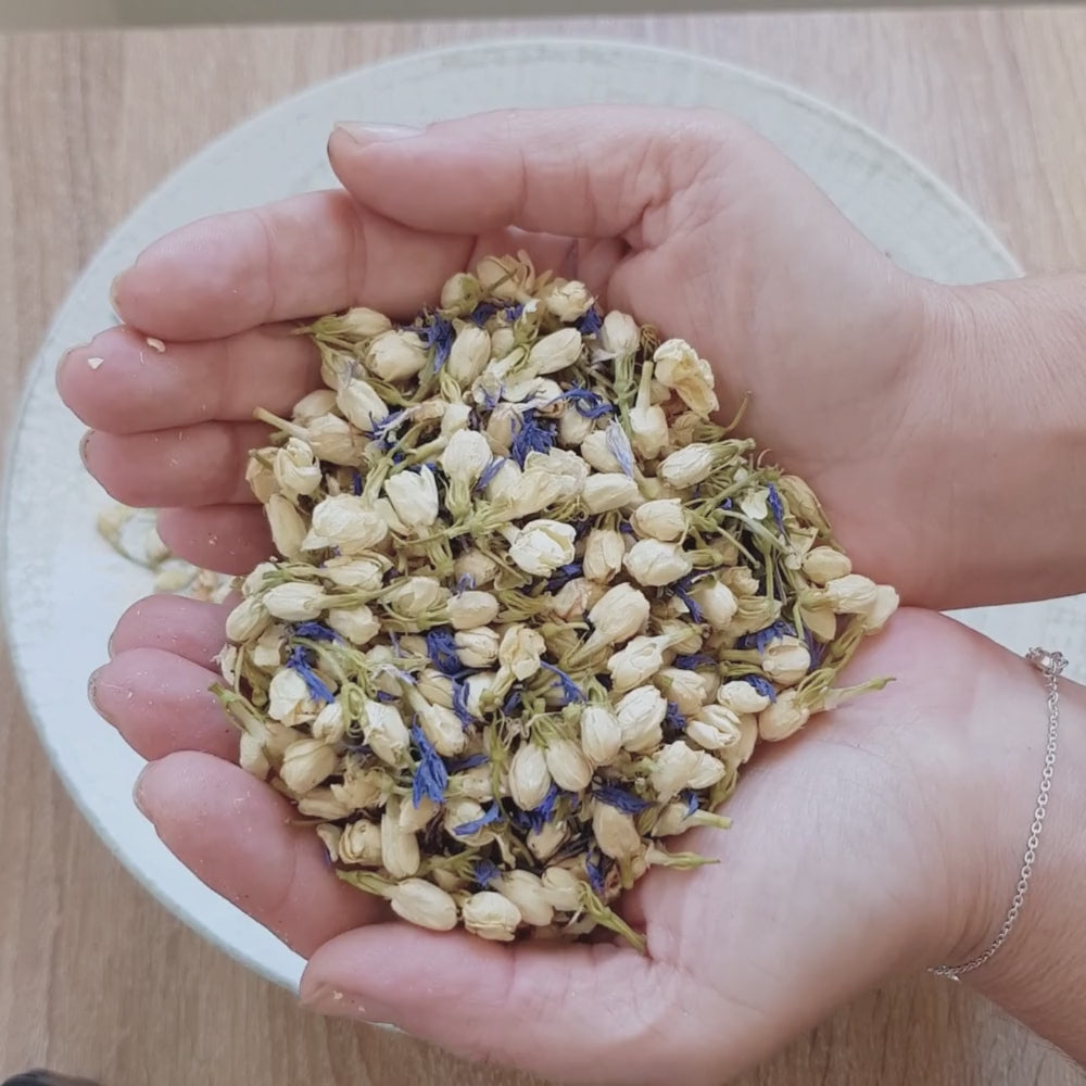 Les fleurs de jasmin sont associées à l'amour et à la pureté, tandis que le bleuet est symbole de bonheur. Mélanger ces deux fleurs apportera une signification particulière à votre journée spéciale. De plus, contrairement aux confettis traditionnels en papier, les fleurs séchées sont écologiques et biodégradables,