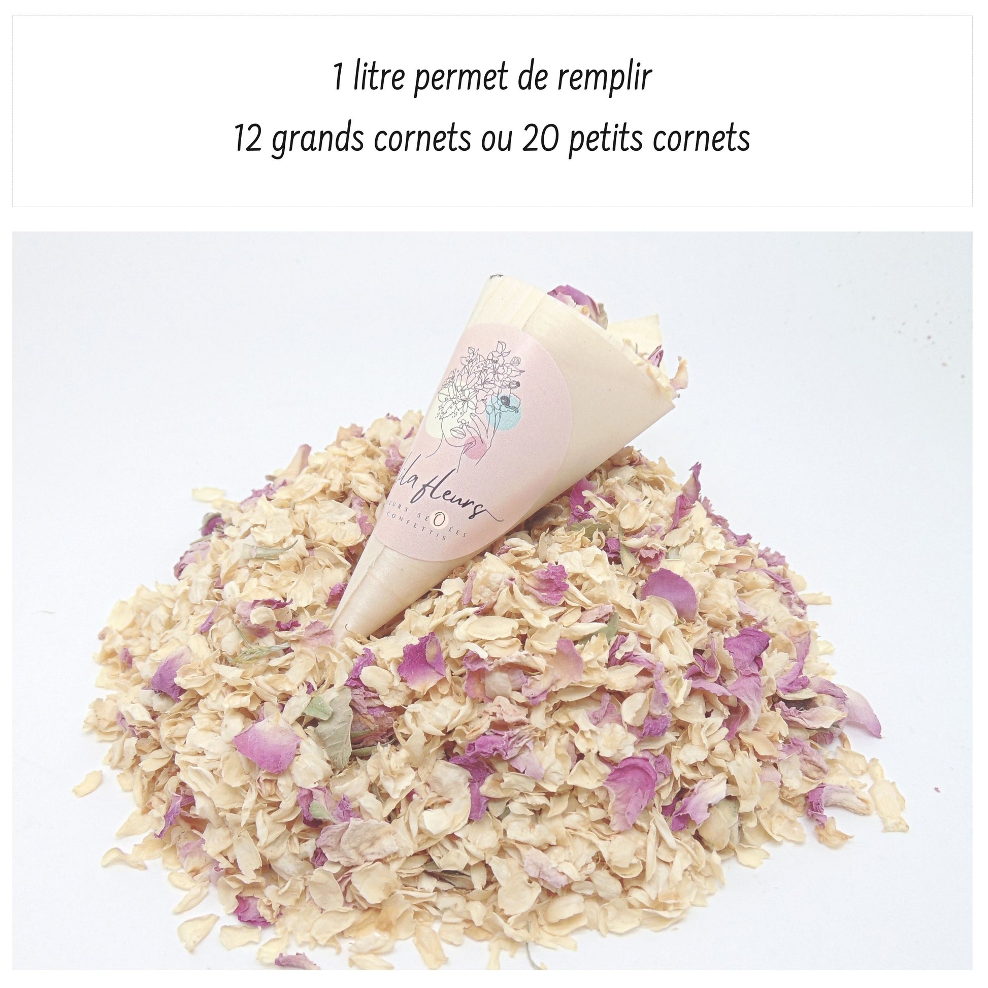 Les confettis de fleurs séchées sont préparés à la commande dans mon atelier en Provence et sont vendus en vrac au litre, un verre doseur de cuisine est utilisé pour mesurer la quantité, 1 litre représente 20 petites poignées soit 20 lancés de fleurs