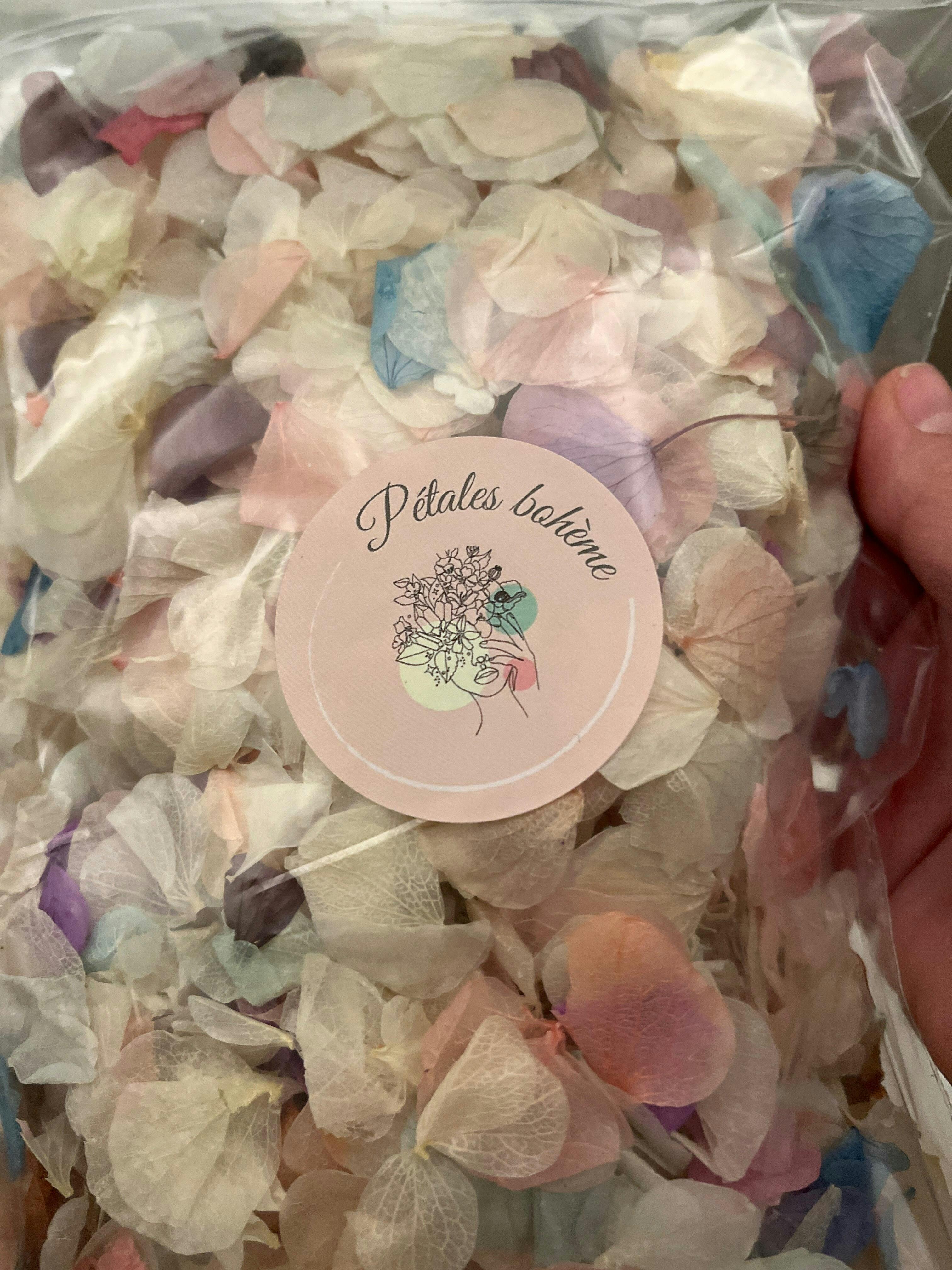 Confettis de mariage en pétales de fleurs séchées : Hortensia multicolore aux tons de Mauve, Violet, ivoire, Rose clair, Bleu